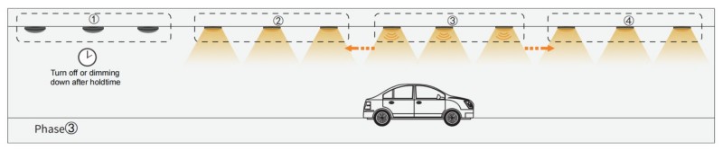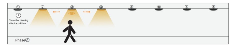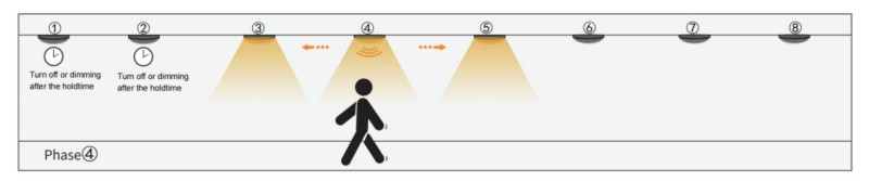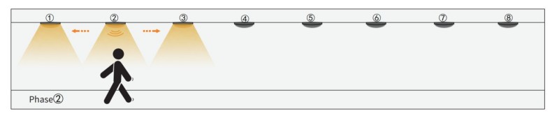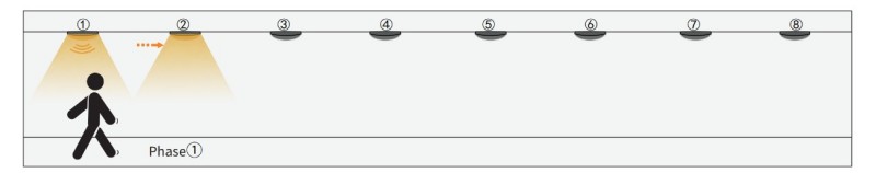 1. ເມື່ອເຊັນເຊີກຸ່ມ 1 ໄດ້ກວດພົບການເຄື່ອນໄຫວໃດໆ, ມັນຈະກະຕຸ້ນ Group Group2 ຄົນຕໍ່ໄປ. ສະນັ້ນກຸ່ມ 1 ແລະ Group2 ຈະເປີດໃຊ້ແຕ່ໄຟສາຍອື່ນໆຍັງຄົງຢູ່. ໃນຂະນະທີ່ສອງເຊັນເຊີໄດ້ຖືກຂຽນໄວ້ໃນ 1 ກຸ່ມ, ມີ 4 ແສງຂອງສອງກຸ່ມນີ້ຈະເປີດໃຊ້ໃນເວລາດຽວກັນ.