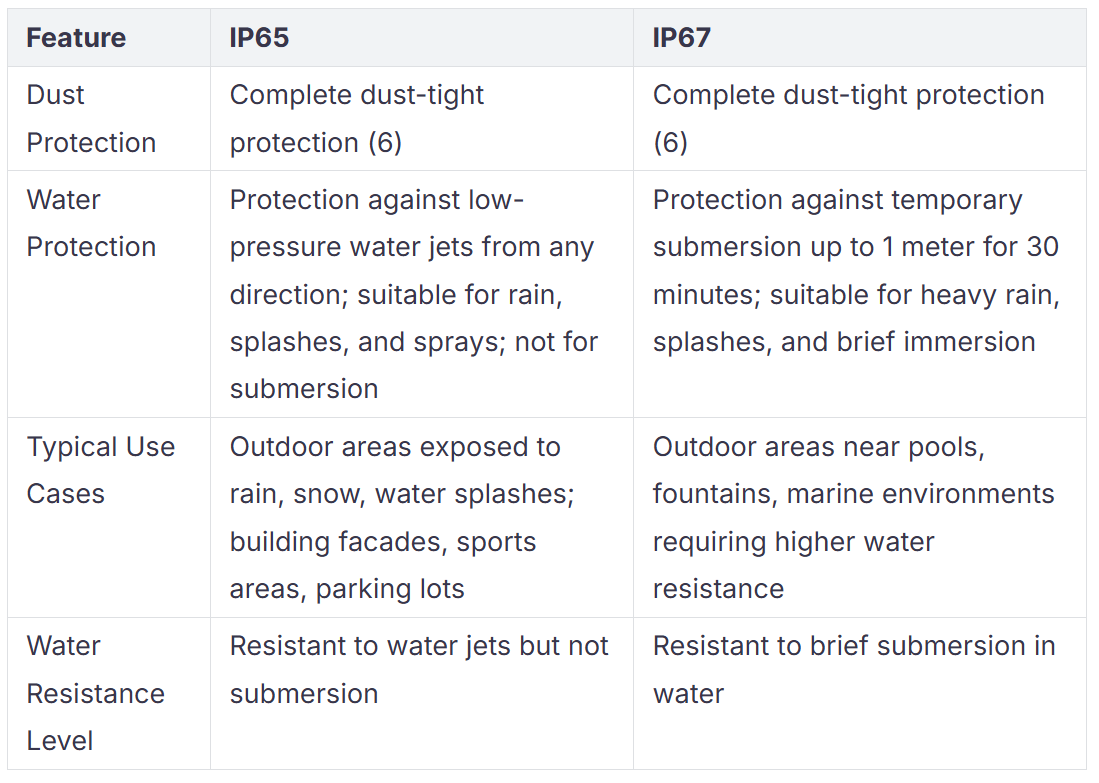 ຄໍາແນະນໍາ: ສໍາລັບການສ່ອງແສງພູມສັນຖານໃນສວນຫຼືທາງຍ່າງ, ໃຊ້ອຸປະກອນປ້ອງກັນນ້ໍາດ້ວຍຢ່າງຫນ້ອຍ IP65. ສໍາລັບທ່າເຮືອຫລືພື້ນທີ່ສະລອຍນ້ໍາ, ເລືອກ iP67 ສໍາລັບຄວາມຕ້ານທານນ້ໍາທີ່ດີທີ່ສຸດ.