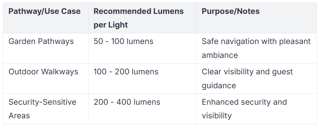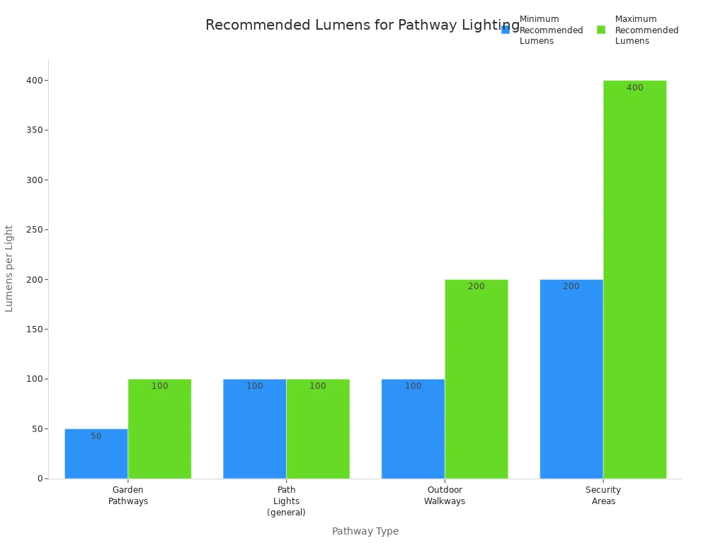 ມັນເປັນສິ່ງສໍາຄັນທີ່ຈະມີເສັ້ນທາງທີ່ປອດໄພຢູ່ຂ້າງນອກ. ເຮັດໃຫ້ມີແສງເສັ້ນທາງ Pathway ຊ່ວຍໃຫ້ຄົນເຫັນບ່ອນທີ່ຈະຍ່າງ. ມັນຍັງຢຸດເຊົາການເດີນທາງແລະຕົກ. ສໍາລັບເສັ້ນທາງສວນ, ໃຊ້ໄຟທີ່ມີ lumens 50-100 lumens. ທາງຍ່າງຕ້ອງການ lumens 100-200 ສໍາລັບແສງສະຫວ່າງທີ່ດີ. ຖ້າທ່ານຕ້ອງການຄວາມປອດໄພເພີ່ມເຕີມ, ໃຫ້ໃຊ້ 200-400 Lumens ຕໍ່ແສງ. ໃສ່ໄຟ LED ກາງແຈ້ງ 6-8 ຟຸດຫ່າງໆສໍາລັບແສງສະຫວ່າງ. ເສັ້ນທາງແຄບຕ້ອງການແສງສະຫວ່າງໃກ້ກັນ. ເສັ້ນທາງກ້ວາງສາມາດມີແສງໄຟຫ່າງໄກກ່ວາ. ວາງໄຟປະມານ 14 ນີ້ວເທິງຫນ້າດິນ. ສິ່ງດັ່ງກ່າວເຮັດໃຫ້ມີໂຄມໂດຍກົງແລະເຮັດໃຫ້ເສັ້ນທາງດີງາມ.
