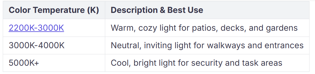 ການເລືອກເອົາອຸນຫະພູມສີທີ່ເຫມາະສົມປ່ຽນແປງວິທີການສະຖານທີ່ຂອງທ່ານມີຄວາມຮູ້ສຶກແລະເຮັດວຽກ. ແສງອົບອຸ່ນ, ຈາກ 2200k ຫາ 3000k, ສະຖານທີ່ທີ່ເຮັດໃຫ້ສະຖານທີ່ຮູ້ສຶກອົບອຸ່ນແລະຕ້ອນຮັບ. ໃຊ້ສິ່ງນີ້ສໍາລັບຊັ້ນໃຕ້ດິນ, ດາດຟ້າ, ຫລືສວນບ່ອນທີ່ທ່ານຕ້ອງການທີ່ຈະພັກຜ່ອນຫລືມີຄວາມມ່ວນກັບຫມູ່ເພື່ອນ. ສີຂາວທີ່ເປັນກາງ, ລະຫວ່າງ 3000k ແລະ 4000k, ໃຫ້ແສງສະຫວ່າງທີ່ຈະແຈ້ງທີ່ບໍ່ສົດໃສເກີນໄປ. ນີ້ແມ່ນສິ່ງທີ່ດີສໍາລັບທາງຍ່າງແລະທາງເຂົ້າດັ່ງນັ້ນທ່ານສາມາດເຫັນໄດ້ດີໂດຍບໍ່ທໍາຮ້າຍຕາຂອງທ່ານ. ສີຂາວເຢັນ, ຢູ່ຂ້າງເທິງ 5000k, ແມ່ນສົດໃສແລະຄົມຊັດ. ໃຊ້ສິ່ງນີ້ເພື່ອເຮັດໃຫ້ມີແສງສະຫວ່າງດ້ານຄວາມປອດໄພຫຼືຈຸດທີ່ທ່ານຕ້ອງການເບິ່ງທຸກຢ່າງຢ່າງຈະແຈ້ງ.