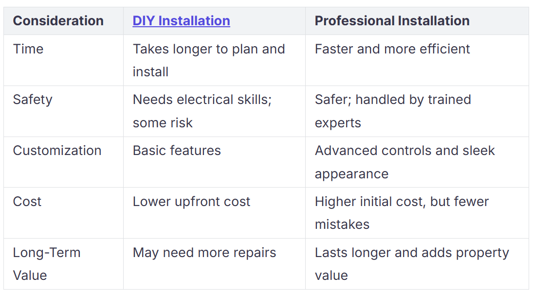 ທ່ານສາມາດໃສ່ໄຟ LED ຢູ່ກາງແຈ້ງໂດຍຕົວທ່ານເອງຫຼືໄດ້ຮັບການຊ່ວຍເຫຼືອ. ການເຮັດມັນດ້ວຍຕົນເອງຊ່ວຍປະຢັດເງິນແລະໃຫ້ທ່ານເລືອກເອົາການອອກແບບ. ທ່ານຈໍາເປັນຕ້ອງຮູ້ບາງຢ່າງກ່ຽວກັບໄຟຟ້າແລະໃຊ້ເວລາໃນການວາງແຜນ. ຖ້າທ່ານເຮັດຜິດ, ມັນສາມາດບໍ່ປອດໄພຫຼືທໍາລາຍໄຟ.