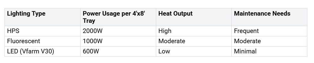 ຄ່າໃຊ້ຈ່າຍພະລັງງານສາມາດເຮັດຫຼືທໍາລາຍສວນໃນລົ່ມຂອງທ່ານ. ໄຟ LED ຂະຫຍາຍຕົວໂດດເດັ່ນສໍາລັບປະສິດທິພາບທີ່ຫນ້າສັງເກດແລະການໃຊ້ພະລັງງານຕໍ່າ. ໃນເວລາທີ່ທ່ານປ່ຽນຈາກ Sodium ຄວາມດັນສູງແບບດັ້ງເດີມ (HPS) ຫຼືໄຟ fluorescent ຫຼືໄຟ LEDS ກັບ LED, ທ່ານສາມາດຕັດພະລັງງານຂອງທ່ານໂດຍ50-70%. ໃນການເຮັດກະສິກໍາແນວຕັ້ງຂະຫນາດໃຫຍ່, ໄຟ LED ໃຊ້ກ່ຽວກັບ600W ຕໍ່ກັບຖາດ 4'x8 ', ໃນຂະນະທີ່ລະບົບ HPS ຕ້ອງການສູງເຖິງ 2000W ສໍາລັບພື້ນທີ່ດຽວກັນ. ນີ້ແປວ່າການປະຫຍັດພະລັງງານທີ່ສໍາຄັນແລະໃບເກັບເງິນພະລັງງານຕ່ໍາ. ໄຟ LEDs ຍັງປ່ອຍໃຫ້ຄວາມຮ້ອນຫນ້ອຍລົງ, ເຊິ່ງຫມາຍຄວາມວ່າທ່ານໃຊ້ເວລາທີ່ທ່ານໃຊ້ເຢັນລົງແລະສາມາດວາງໄຟໄດ້ໃກ້ຊິດກັບພືດຂອງທ່ານ. ຜູ້ຂັບຂີ່ແບບປະສົມປະສານກັນຂອງ VFARM V30 ແລະ IP65 ເຮັດວຽກທີ່ຫນ້າເຊື່ອຖືໃນສະພາບແວດລ້ອມທີ່ຕ້ອງການ, ຫຼຸດຜ່ອນຄ່າໃຊ້ຈ່າຍໃນການບໍາລຸງຮັກສາແລະປະຕິບັດງານຕໍ່ໄປ.