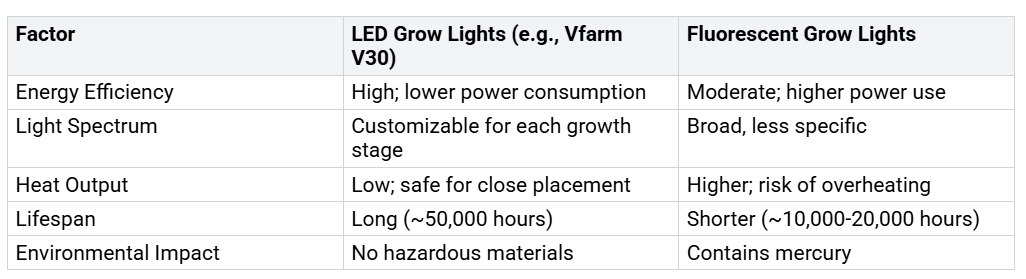 ໃນເວລາທີ່ທ່ານສົມທຽບໄຟ LED ຈະມີແສງສະຫວ່າງໃນຕົວເລືອກ fluorescent, ທ່ານເຫັນໄດ້ຢ່າງທີ່ກ່ຽວຂ້ອງຢ່າງຈະແຈ້ງໃນປະສິດທິພາບດ້ານພະລັງງານ, ສຸຂະພາບຂອງພືດ, ແລະບໍາລຸງຮັກສາ. LEDs ຄືກັບ FanXStar VFARM VFARM V30 ສະເຫນີການສະເຫນີໄຟຟ້າແສງທີ່ສາມາດປັບປ່ຽນໄດ້, ມີອາຍຸຍືນ, ແລະການປະຕິບັດງານທີ່ປອດໄພກວ່າ. ໄຟເຍືອງທາງ fluorescent, ດັ່ງກ່າວເປັນທໍ່ T5, ໃຫ້ໃຊ້ພະລັງງານຫຼາຍ, ສ້າງຄວາມຮ້ອນຫຼາຍ, ແລະມີອາຍຸສັ້ນກວ່າ. ພວກມັນຍັງມີວັດສະດຸທີ່ເປັນອັນຕະລາຍເຊັ່ນ Mercury, ເຊິ່ງຕ້ອງການການກໍາຈັດພິເສດ.