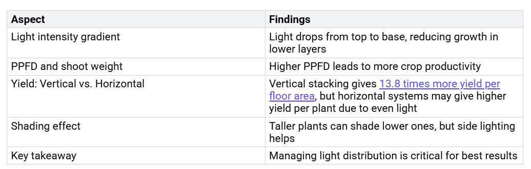 ທ່ານເຫັນຫຼັກຖານທີ່ຈະແຈ້ງຈາກການສຶກສາວິທະຍາສາດທີ່ມີແສງການເຕີບໃຫຍ່ແບບແນວຕັ້ງສາມາດຫັນປ່ຽນການເຕີບໂຕຂອງພືດແລະຜົນຜະລິດ. ນັກຄົ້ນຄວ້າໄດ້ວັດແທກວິທີການປ່ຽນແປງແນວທາງແສງສະຫວ່າງຈາກສ່ວນເທິງໄປຫາຖານຂອງຖັນແນວຕັ້ງ. ພວກເຂົາເຈົ້າໄດ້ພົບເຫັນວ່າຊັ້ນລຸ່ມມັກຈະໄດ້ຮັບແສງຫນ້ອຍ, ເຊິ່ງສາມາດຈໍາກັດການເຕີບໂຕ. ເຖິງຢ່າງໃດກໍ່ຕາມ, ເມື່ອທ່ານໃຊ້ກົນລະຍຸດດ້ານຂ້າງຫຼືການຂັດຂວາງ, ທ່ານສາມາດເພີ່ມການສໍາຜັດຂອງເບົາສໍາລັບທຸກຊັ້ນແລະປັບປຸງຜະລິດຕະພັນ.