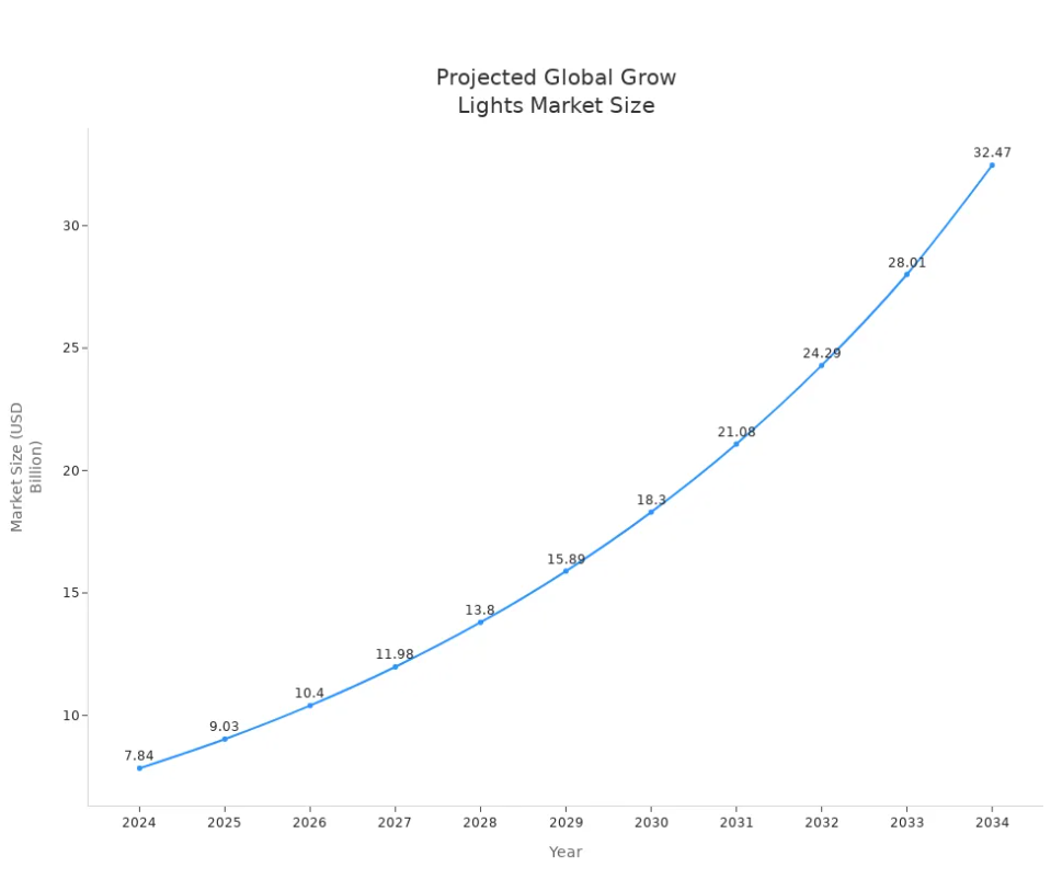 ຜູ້ຊ່ຽວຊານຕົກລົງເຫັນດີວ່າລະບົບໄຟ LED ທີ່ສະຫຼາດທີ່ມີລະບົບການຄວບຄຸມທີ່ຊັດເຈນຊຸກຍູ້ການຈະເລີນເຕີບໂຕຂອງພືດແລະຜົນຜະລິດ. ໄດ້ຕະຫຼາດສໍາລັບວິທີແກ້ໄຂເຫຼົ່ານີ້ຍັງສືບຕໍ່ຂະຫຍາຍອອກຢ່າງໄວວາ, ດັ່ງທີ່ສະແດງຢູ່ດ້ານລຸ່ມ: